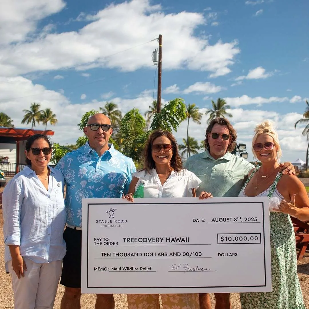 Stable Road Foundation presents a gift to local partners TreeCovery Hawaii to help them plant indigenous trees on the properties of new homes for fire survivors.